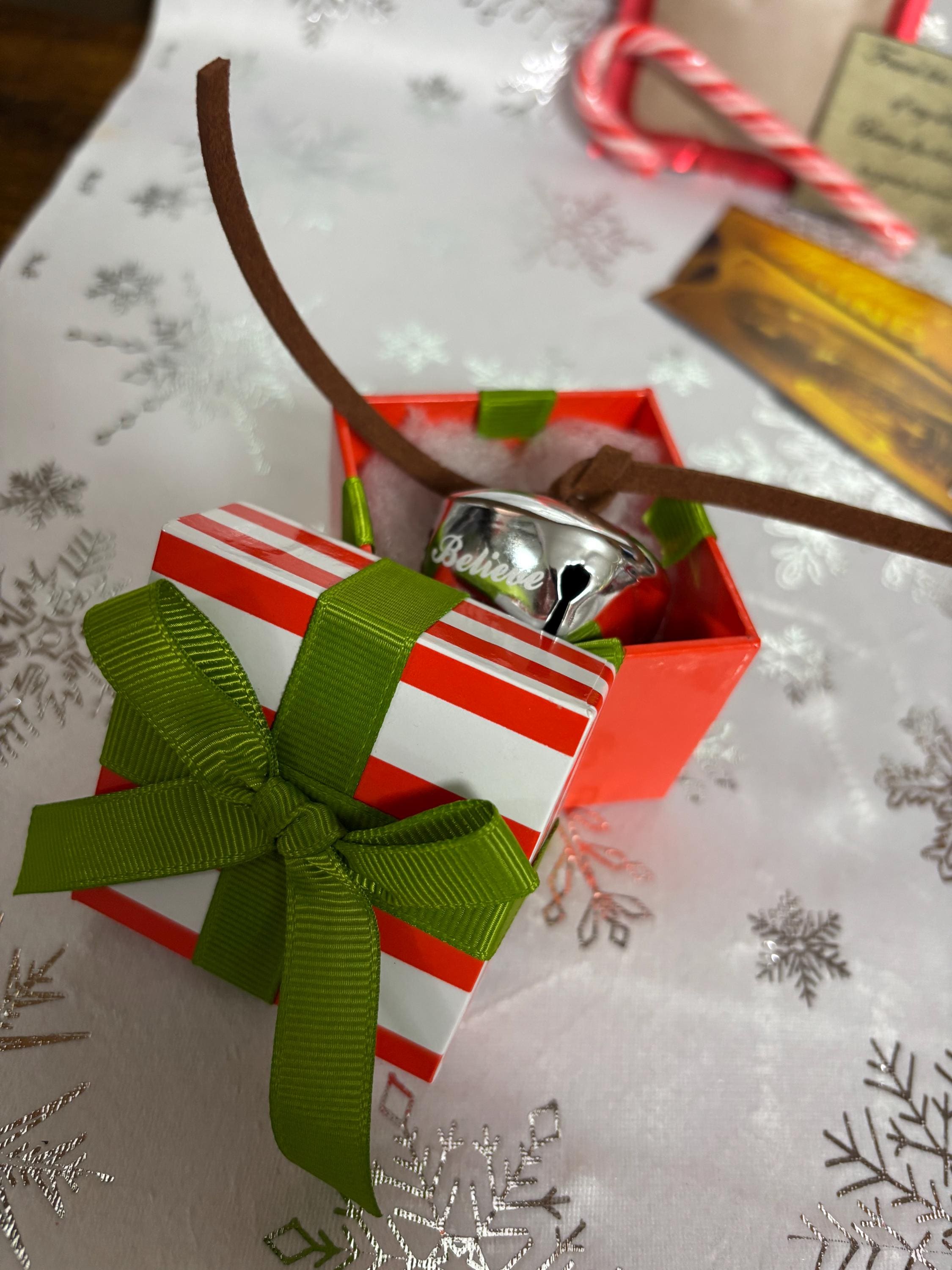 a 3.5cm large jingle reindeer bell with brown leather cord and a believe engraved on bell